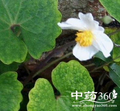 【原形态】血水草 多年生草本,高30-60cm。植株具红橙色汁液。根和根茎匍匐,黄色。茎紫绿色,有光泽。叶基生;叶柄细长,长10-30cm,基部具窄鞘;叶片卵圆状心形或圆心形,长5-26cm,宽5-20cm,先端急尖,基部耳垂状,长2-9cm,表面绿色,背面灰绿色,有白粉,掌状脉5-7条,细脉网状,明显,边缘呈波状。花季灰绿色而略带紫红色,高20-40cm,有花3-5朵,排列成伞房状聚伞花序;苞片和小苞片卵状披针形,长0.2-lcm,先端渐尖;花萼2,盔状,长0.5-1.5cm,无毛,先端渐尖,基部合生,早落;花瓣4,白色,倒卵形,长1-2.5cm,宽0.7-1.8cm;雄蕊多数,花丝长0.5-0.7cm,花药长圆形,长约0.3cm,黄色;子房卵形或窄卵形,长0.5-1cm,无毛,花柱长0.3-0.5cm,柱头2裂。蒴果长椭圆形,长约2cm,直径约0.5cm,先端稍细小。花期3-6月,果期5-7月。