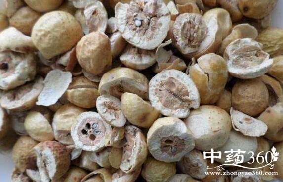 干燥果实呈球形或椭圆形,表面黄色或黄棕色,微具光泽,具深棕色或黄棕色圆点,微有凹陷或皱缩。一端凹陷,有果柄脱落痕迹,另一端较平,有一棕色点状蒂痕;果皮革质,与果肉间有空隙。果肉厚,浅黄色,质松软。果核球形或卵圆形,两端平截,土黄色,表面具6~8条纵棱,内分6~8室,含黑紫色扁梭形种子6~8枚。种仁乳白色,有油性;闻之有股特异气味,口尝味酸而苦。