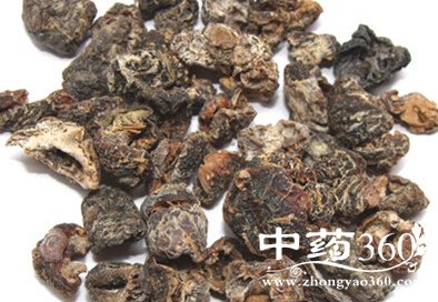 干燥果实呈圆形或不规则的圆形,微显六瓣状,径约2厘米;表面棕褐色,粗糙不平,有细小的疣状突起,基部遗有圆点状的果柄痕迹。质坚实,不易破碎,破碎后内显黄白色;种子不大。气微,味甜带涩。以干燥、饱满,无果柄及叶片掺杂者为佳。
