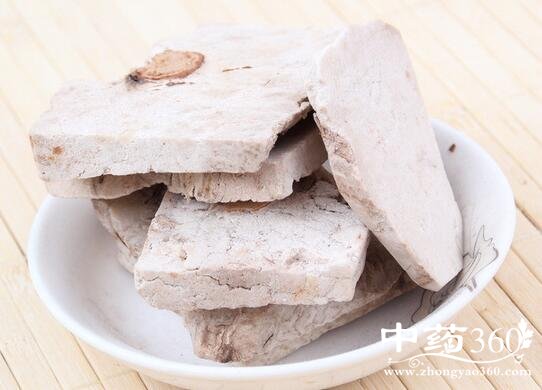 为多孔菌科真菌茯苓的干燥菌核。多寄生于松科植物赤松或马尾松等树根上。味甘、淡,性平。归心、脾、肾经。功能利水渗湿、健脾和中、宁心安神。适用于水肿尿少、痰饮眩悸,脾虚诸证如脾虚食少、便溏带下,以及心脾两虚见心神不安、心悸失眠等。