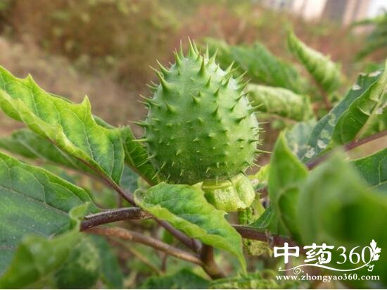 性状鉴别 (1)白曼陀罗子 蒴果近球形或扁球形,直径约3cm,茎部有浅盘状宿萼及短果柄。表面黄绿色,疏生粗短刺。果皮木质化,成熟时作不规则4瓣裂。种子多数,扁平,三角形,宽约3mm,淡褐色。气特异,味微苦。有毒。