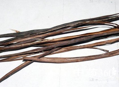 【药材】蒴果呈狭线形,新鲜时,有强粘着性,熟时渐次消失。长20~30厘米,粗5~9毫米,稍弯转,暗棕色乃至黑棕色,有细纵皱并有光泽细点,粗糙而脆。基部有果柄。先端常破裂,露出种子。种子淡褐色,菲薄,长5毫米,阔2~3毫米,上下两端有长1厘米许白色光泽毛茸,中央内面有暗色脐点。种皮除去后即为胚,有子叶2片。几无味,微有收敛性。