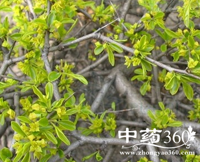 【原形态】小叶鼠李 灌木,高约2m。小枝对生或近对生,紫褐色,初时被短柔毛,后变无毛,光滑,枝端及分叉处有针刺。叶对生或互生,或簇生于短枝上;叶柄长4-15mm,被细柔毛;托叶钻状,有微毛;叶片纸质,菱状倒卵形或菱状椭圆形,长1-4cm,宽1-3cm,先端钝尖或近圆形,基部楔形或近圆形,边缘具细锯齿,上面深绿色,无毛或被疏短柔毛,下面浅绿色,干时灰白,无毛。花单性,雌雄异株,黄绿色,通常数个簇生于短枝上;萼片4;花瓣4;雄蕊4;雌花花柱2半裂。核果倒卵状球形,直径4-5mm,成熟时黑色,具2分核,基部有宿萼。种子长圆状倒卵圆形,褐色,背面有长为种子4/5的纵沟。花期4-5月,果期6-9月。