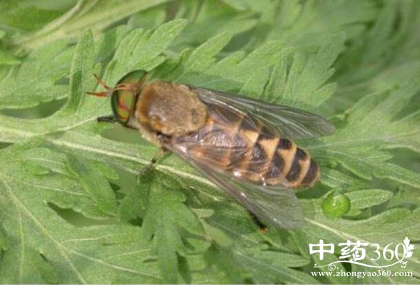4.江苏虻:为虻科昆虫江苏虻 Tabanus kingsuensis Krober.的雌虫体。形似蜜蜂,体长1.2~1.5cm。前额呈灰黄色,胛黑棕色,中胛与基胛融合成柱状,基胛两侧与眼分开,触角黄色。第三节背缘具不明显的钝突,胸部呈灰色,背板具5条明显纵纹,侧片浅灰色具长白毛。翅透明,平衡棒呈棕色、足灰色、胫节浅棕色;后缘具细白横带,腹板黑色,后缘具白横带。