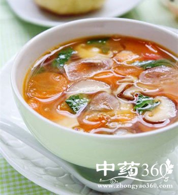 3、番茄先烫过去皮,加入汤里。
