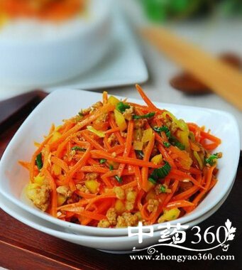 做法:胡萝卜洗净去皮,擦成丝;肥瘦肉剁成碎肉;生姜洗净去皮,切碎;酸咸菜切小丁,蒜苗洗净切碎备用;锅中放入少许油加热至五成,放入碎肉和生姜碎翻炒至颜色变白,然后依次放入料酒和老抽翻炒均匀;锅中放入适量油加热,放入胡萝卜丝翻炒片刻,加入少许生抽和盐调味;然后依次放入炒好的碎肉、咸酸菜和蒜苗碎,翻炒均匀即可出锅。