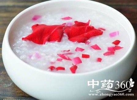 做法用新鲜粳米熬制成粥,煮熟后加入适量的玫瑰花蕾,待粥熬成粉红时,即可食用。
