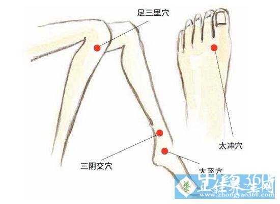 位置:脚内踝有个凸出来的骨头,从内踝往上,四根手指的距离,小腿内侧胫骨后方,就是三阴交穴。