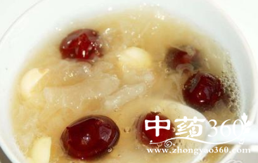 银耳红枣羹:银耳25克,红枣15克,陈皮6克,鸡蛋1个,冰糖适量。先将红枣去核与银耳同煮30分钟,然后放陈皮再煮10分钟,加冰糖,打入鸡蛋,拌匀即可食用。此方有养颜美肤、祛皱纹、消色斑之功效,常服可使皮肤白嫩、细腻、富有弹性。