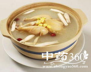 【做法】先将前三味用米酒洗后,切成薄片装入布袋,加入鸡汤和清水,煎出药汁。去布袋后加入粳米,用旺火烧开,再转用文火熬煮成粥。日服1剂,分数次食用。