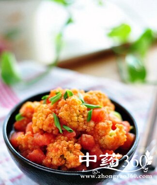 2、勺内放色拉油25克,加入番茄酱炒熟,加白糖、清水、味精、精盐、醋调好口味,烧开后用水淀粉勾芡,芡熟放菜花,颠翻出勺,淋上剩余的色拉油出勺即成。