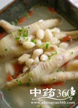 花生凤爪汤:花生仁(连衣)50克,鲜鸡爪5对,红枣10枚,调料适量;将上料洗净后加水炖煮至鸡爪烂熟。具有补气血、壮腰膝的功效。