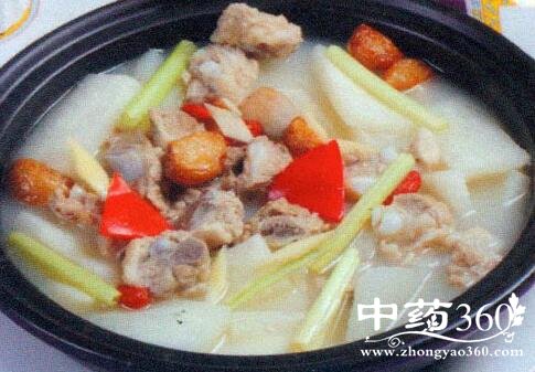烹调方法:排骨洗净、斩件、氽水;药材稍加冲洗。将所有材料放入瓦汤煲内,加水1500ml,武火煮15分钟后改文火煲约45分钟,加少量食盐调味即可。