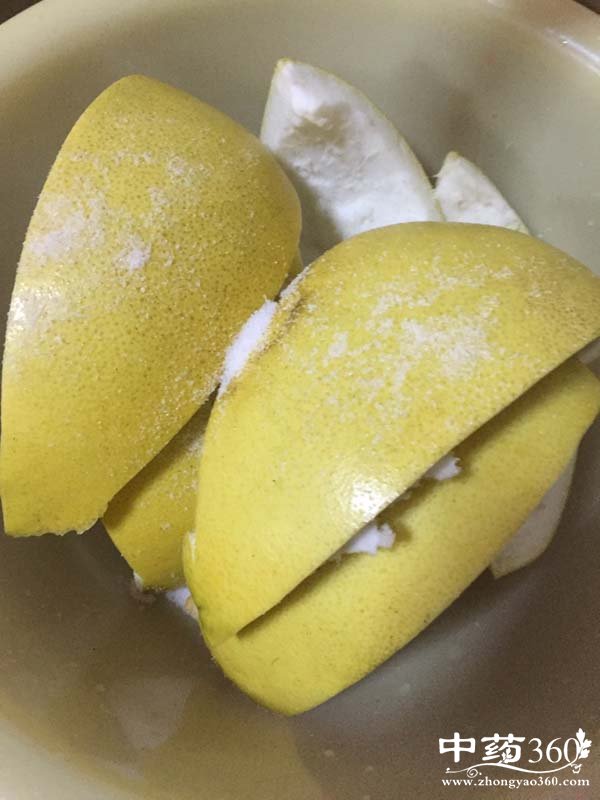 然后浸泡5分钟,这样一方面是可以把柚子皮洗干净,同时也是利用水温,让柚子皮的毛孔张开来。好,现在5分钟过去了,把柚子用干净的毛巾吸去水分。然后将剥开,注意要分三部分。首先是柚子皮,然后是柚子皮与柚子果肉之间的白瓤,最后是柚子肉。
