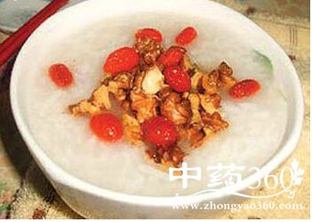 核桃肉50克,捣烂.粳米50克,加水如常法煮粥.粥熟后把核桃肉加入,调匀,略煮沸、浮起粥油时即可食用.可于早、晚各温服1次.对有泻泄、便溏的病人,不宜服用.