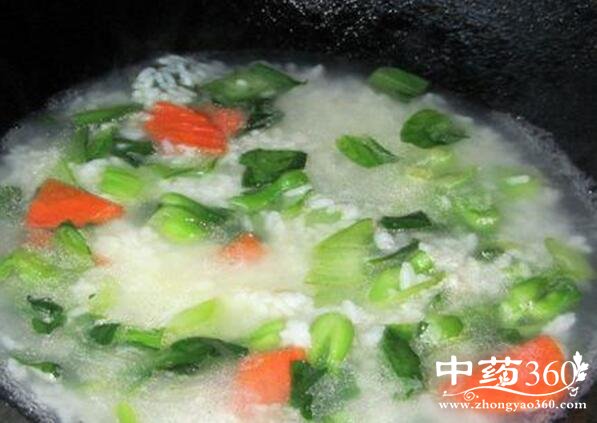 原料:猪骨汤1.5升、山药100克、大米100克、青菜1~2棵、盐和胡椒粉适量。