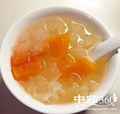 原料:雪耳25克,木瓜1个,北杏15克,南杏20克,冰糖适量。