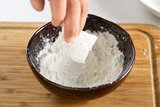 3 面粉放入一个碗中,将腌好的豆腐用筷子夹住在面粉中稍微蘸一下,多余的面粉抖掉。
