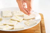将北豆腐切成5厘米乘以3.5厘米的块,厚度大约是5毫米。