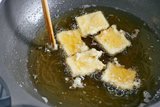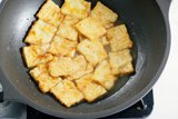 5 锅中放油(实耗100g),中火加热,待油温达到7成热的时候,放入豆腐炸至金黄捞出备用。