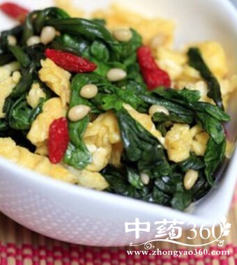 材料:茼蒿,枸杞,鸡蛋,松仁。