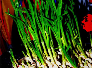 青蒜是大蒜青绿色的幼苗,以其柔嫩的蒜叶和叶鞘供食用。品质好的青蒜应该鲜嫩,株高在35厘米以上,叶色鲜绿,不黄不烂,毛根白色不枯萎,而且辣味较浓。