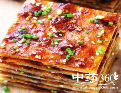 7、将六个全部做完,放一边饧。取其中一个,用擀面杖擀成薄薄的饼。平底锅烧热,倒入适量花椒油,要比普通炒菜多些,半煎半炸的感觉(如果没有炸那么多,可以放普通的油)。中小火,用擀面杖将饼挂起来,平底锅用左手握住,稍微倾斜,顺势将饼放入。饼放入后,受热,立即起鼓分层了,半煎半炸的火候,令其表皮酥脆。底面变金黄色,将其翻面,抹上炒好的肉酱。撒上小葱碎。撒上熟芝麻。饼底金黄色,即可出锅。用刀切小块即可。