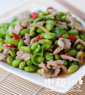 原料:鲜毛豆300g,油、盐、瘦猪肉、料酒、红椒、豆豉、生姜、酱油各适量。