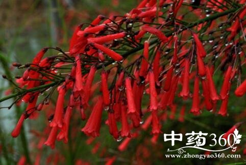 多分枝丛生半灌木,高约1m,茎初直立,先端弯垂,花时因重力作用而下垂。小枝轮生,细长,节明显。叶卵形或线状披针形,多退化而微小。由聚伞花序组成的大型圆锥花序具花多朵,向下弯垂;花鲜红色,花冠管状,略二唇形,长约2.5cm。蒴果球形。花期主要在3~6月,暖地常终年开花不绝。草本,直立,高可达1m。木贼状,几乎无叶。全株无毛。茎四棱形,枝纤细轮生,顶端下垂。叶小,散生;叶片长圆形至长圆状卵形,长不及1.5cm,在枝上的大部退化为鳞片。除伞圆锥花序狭长,小聚伞花序有花1-3朵;总花梗长达3mm,5深裂过半,裂片卵状三角形,急尖,覆瓦状排列;花冠鲜红色,长约2.5cm,具长筒,不明显2唇形,上唇2裂,裂片卵形或长卵形,长约3mm,下唇3裂;雄蕊4,内蒙,退化雄蕊极小,位于花冠筒基部的后方。蒴果球形,室间开裂。花期4-7月。