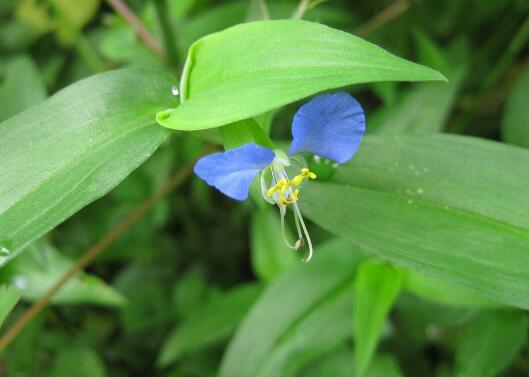 【原形态】大苞鸭跖草,多年生直立粗壮草本,高约80cm。不分枝或上部分枝,幼枝一侧被1条棕色柔毛,后变为无毛。叶互生;叶片披针形或卵状披针形,长10-16cm,宽2-4.5cm,先端长渐尖,基部渐狭两面被疏柔毛或短刚毛;叶鞘宽大,长2.5-3cm,宽0.8-1.5cm,边缘密被棕色长睫毛。总苞片数个在茎顶集成头状,下缘合生成扁的漏斗状,长约2cm;聚伞花序有花3-7,具短梗;萼片3,膜质,披针形,长约5mm;花瓣3,蓝色,薄膜质,匙形或倒卵圆形,长5-8mm,宽约4mm,内面2片具爪;雄蕊6,发育雄蕊3,花丝无毛;子房近椭圆形,3室。蒴果倒卵状三棱形,长约4mm,3瓣裂,每室有1颗种子。种子椭圆形。花期6-8月,果期9-12月。