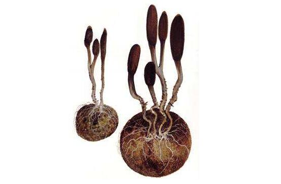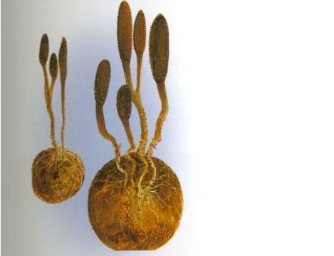 【原形态】大团囊虫草 子座由根状、多分枝的菌丝索固定于土下的寄主上,地上部分高2-8cm。柄粗1-2.5mm,少分枝,暗绿色至紫褐色,有纵纹。头部椭圆形、倒卵形至棒形,长5-13mm,粗3-5mm,暗褐色,干后近黑色。子囊壳卵形,(600-650)μm×300μm,孔口凸出。子囊细长,(300-400)μm×(7-8)μm。孢子线形,透明无色,有多数横隔,成熟时断裂成(3-4)μm×(2-2.5)μm的小段。
