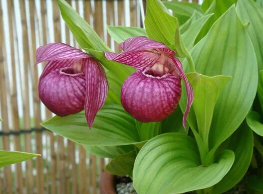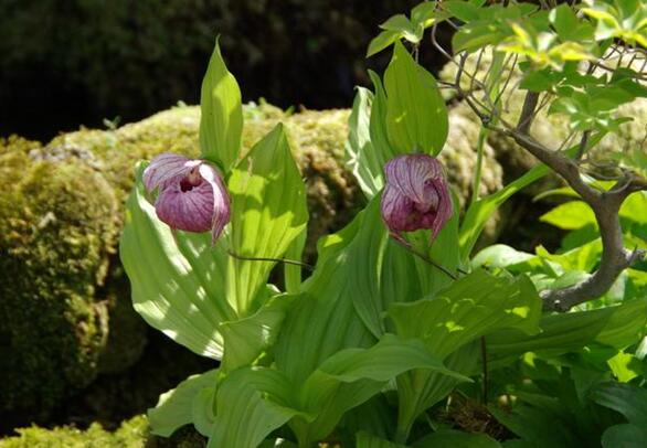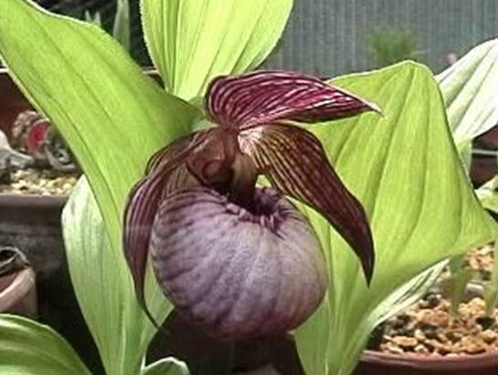 【原形态】大花杓兰,草本,高30-45cm。根茎短,生多数细长须根,土黄色。茎直立,粗壮,具3-5片叶。叶互生;叶片椭圆形或卵状椭圆形,先端短渐尖,基部收狭成鞘抱茎,全缘,上面深绿色,下面浅绿色,两面均被细毛。花大,单生,少为2朵,顶生;紫红色,极少花为白色;中萼片宽卵形,长4-5cm;合萼片卵形,较中萼片短而狭,急尖具2齿;花瓣披针形,较中萼片长,内面基部具长毛;唇瓣几乎与花瓣等长,紫红色或黑紫色,囊内底部与基部具长柔毛,上部的前面内弯;退化雄蕊近卵状箭形或长圆状箭形,长10-17mm,色浅或为黑紫色;子房被短柔毛至无毛。花期5--7月。