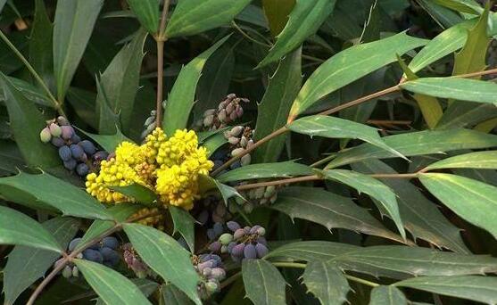 1.阔叶十大功劳 常绿灌木,高1-4m。茎表面土黄色或褐包,粗糙,断面黄色。叶互生,厚革质,具柄,基部扩大抱茎;奇数羽状复叶,长25-40cm,小叶7-15片,侧生小叶无柄,阔卵形,大小不等,长4-12cm,宽2.5-4.5cm,顶生小叶较大,有柄,先端渐尖,基部阔楔形或近圆形,边缘反卷,每边有2-8枚大的刺状锯齿,上面深绿色,有光泽,下面黄绿色。总状花序生于茎顶,直立,长5-10cm,6-9个簇生,小苞片1;萼片9,排成三;花黄褐色,花瓣6,长圆形,先端2浅裂,基部有2密腺;雄厚蕊6;雌蕊1。浆果卵圆形,直径约5mm,成熟时蓝黑色,被白粉。花期8-10月,果期10-12月。