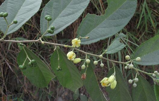 【原形态】寡蕊扁担杆 灌木。嫩枝被星状茸毛,老枝暗褐色。叶互生;叶柄长5-8mm;托叶钻形,早落;叶片披针形或长圆状披针形,纸质,长9-10.5cm,宽2-3.5cm,先端锐尖,基部圆形,上面有稀疏星状短粗毛,干后变暗褐色,下面密被灰褐色软茸毛,边缘有大小相间的细锯齿;三出脉的两侧脉到达叶片中部,中脉有侧脉4-5对。聚伞花序有花3-5朵,花序柄长4-7mm;花柄长3-4mm,均被茸毛;苞片长3-4mm,萼片长5-6mm,外面有茸毛,内面无毛;花瓣长圆形,长2-3mm;腺体鳞片状,周围有毛;雄蕊比萼片短;子房被毛,柱头多裂。核果双球形或四球形,直径约1cm,发亮。花期8月。