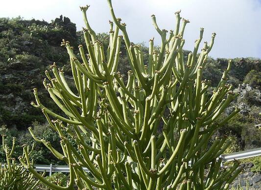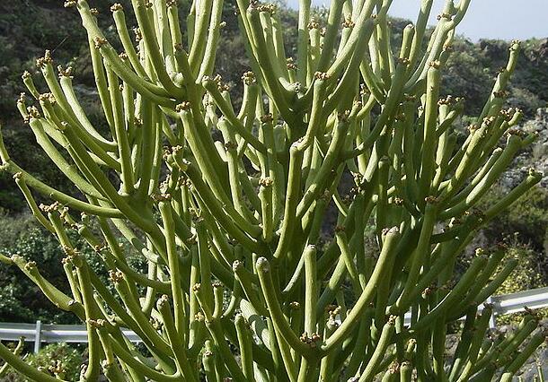 光棍树是属于大戟科的一种肉质木本植物,原产东非、南非的热带干旱地区。整株树无花无叶,仅剩光秃秃的枝丫,犹如一根根棍棒插在树上。故人们戏称为“光棍树”,也有人叫它“绿玉树”、“神仙棒”。光棍树的茎中含有乳白色的汁液,故又有人叫它“牛奶树”,它茎干中的白色乳汁可以制取石油。