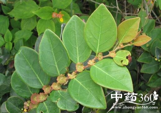 【原形态】 直立灌木,高2—3米。树皮灰棕色,枝圆柱状,多叉状弯曲,表面有白色细小皮孔。单叶互生;有短柄;卵形或卵状披针形,长3—5厘米,宽1.5—2.5厘米,先端钝形或短尖,基部楔形,全缘,叶脉细小,下面隆起,叶革质,上面暗绿色,下面灰绿色,干后变黑色。花极小,2—4朵腋生,单性,同株;无花瓣和花盘;雄花花萼呈陀螺形或半圆形,截头状,边缘甚厚,有时分裂;雄蕊3,花丝合生成一柱;退化子房缺;雌花花萼稍大,基部呈陀螺形,上部扩张,结果时扩大成盘状或杯状;退化雄蕊缺;子房球形,花柱3枚,2裂。核果球形,径约6毫米,位于宿存萼上。花期4—9月。
