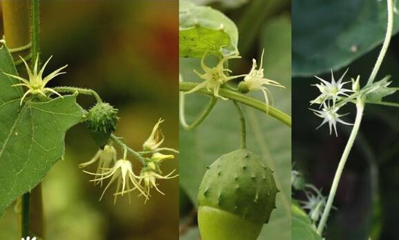 【原形态】柔弱草本。枝纤细,疏被长柔毛,后变无毛。叶柄细,长2-6cm,被短柔毛回去形变异较大,心状戟形、心状狭卵形或披针状三角形,不分裂或3-5裂或仅在基部分裂,边缘波状或具小圆或具疏齿,基部弯曲半圆形、长圆形、深心形,裂片顶端狭三角形,先端渐尖,两面具疏散状凸起,长3-12cm,宽2-8cm。卷须细,2歧。花单性,雄花总状或圆锥状花序,小花序基部有长6mm叶状3裂的总苞片,生于短缩的总梗上;花萼裂片线状披针形,边缘有疏小齿;花冠片披针形,黄绿色,具1脉,稀3脉,疏生短柔毛;雄蕊5,花丝有毛或无毛;雌花单生、又生或雌雄同序;雌花梗具关节,花萼和花冠同雄花;子房卵状,有券状突起。蒴果绿以,卵形、滋长卵形、长圆状椭圆形,长1.6-2.5cm,径1-2cm,疏生暗绿以鳞片状凸起,成熟时近中部盖裂,果盖锥形。具种子2-4颗,种子灰折色,对合,表面有不规则的雕纹,长11-13mm,宽8-9mm,厚3-4mm。花期7-9月,果期9-11月。