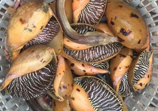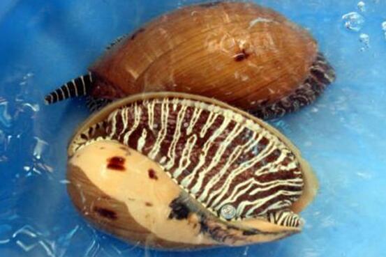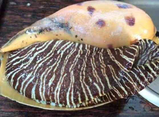 【原形态】瓜螺,贝壳卵形或近球形,质 尚坚,一般高160-257mm,宽112-178mm,螺旋部极小,几乎被体螺层包被,仅露出略呈乳头状的壳顶,有时且低于体螺层,体螺层则极度膨大。壳表被有黄褐色或污褐色壳皮,壳皮脱落后露出杏黄色的壳面。幼体时常具明显的横列红褐色大型斑块,成体常消失不显。壳面较光滑,生长线细密。壳口大,卵圆形,内为光亮的橘黄色,外唇弧形,薄,易破损;内唇稍厚,扭曲,紧贴于体螺层上。下部具4条明显的皱褶。前沟短而宽,凹入,形成一大缺刻。无厣。足肥大,有花纹。