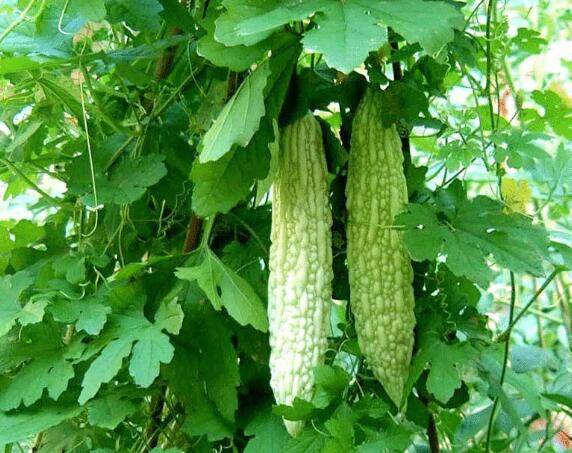 【原形态】苦瓜,一年生攀援草本,多分枝,有细柔毛,卷须不分枝。叶大,肾状圆形,长宽各约5-12cm,通常5-7深裂,裂片卵状椭圆形,基部收缩,边缘具波状齿,两面近于光滑或有毛;叶柄长3-6cm。花雌雄同株。雄花单生,有柄,长5-15cm,中部或基部有苞片,苞片肾状圆心形,宽5-15mm,全缘;萼钟形,5裂,裂片卵状披针形,先端短尖,长4-6mm;花冠黄色,5裂,裂片卵状椭圆形,长1.5-2cm,先端钝圆或微凹;雄蕊3,贴生于萼筒喉部。雌花单生,有柄,长5-10cm,基部有苞片;子房纺锤形,具刺瘤,先端有喙,花柱细长,柱头3枚,胚珠多数。果实长椭圆形,卵形或两端均狭窄,长8-30cm,全体具钝圆不整齐的瘤状突起,成熟时橘黄色,自顶端3瓣开裂。种子椭圆形,扁平,长10-15mm,两端均具角状齿,两面均有凹凸不平的条纹,包于红色肉质的假种皮内。花期6-7月。果期9-10月。