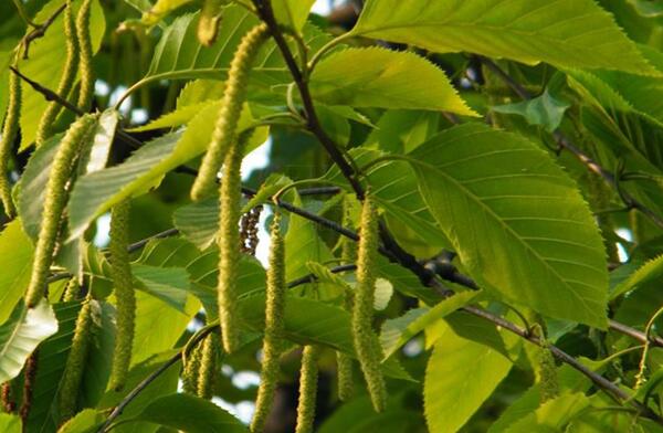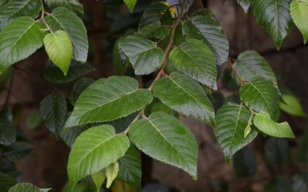 乔木,高达25米。树皮淡黄褐色,老则呈暗黄灰色或红褐色,光滑不裂,有清香气。叶卵形至矩圆形,长5~12厘米,先端长尖,基部圆形、棵形或截形,边缘复锯齿之齿端长尖,上面几无毛,下面沿脉疏生毛,侧脉12~14对;叶柄长1~2厘米,密生短柔毛和腺点。果序单生,长圆柱状,下垂,长3~9厘米,直径6~10毫米;果序柄长1~2厦米;果苞长2~3毫米,中裂片矩圆形至披针形,侧裂片卵形,有时不发育;翅果倒卵形,长2毫米,膜质翅宽为果的2~3倍。