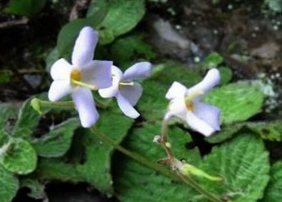 【原形态】扭果苣苔 无茎多年生草本,高7-14cm。根茎粗短,密生纤维状须根。叶基生;叶柄长0.5-6cm,密被短伏毛;叶片革质。卵形或宽卵形,有时近圆形,长2-7.5cm,宽1.5-4cm,先端钝,基部截形、心工宽楔形,边缘有钝锯齿,两面均具短糙伏毛。上面绿色,下面淡绿色。花葶2-4条,高7-14cm,密被短糙伏毛;聚伞花序,有花2-10朵;苞片卵形,长约7mm;小苞片线形,微小;花萼钟形,长约5mm,5浅裂,裂片近相等,三角形;花冠白色或粉红色,钟状筒形,长约2.4cm,外面被疏毛,冠桅稍偏斜,5裂,裂片近相等;雄蕊4,能育雄蕊2,内藏,花药相连;子房细长,被短毛。蒴果线形,长约3.8cm,螺旋状扭曲,变无毛。花期7-8月。果期9-10月。
