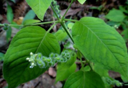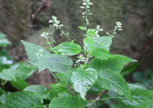 【原形态】多年生草本,高40-70cm。具地下铺匐枝;芭圆柱形,绿色,全株被毛,茎被长展毛和稍弯的尖柔毛。叶对生;叶柄长4-8cm,密被短柔毛;叶片卵形或阔卵形,长3-6cm,宽2-4cm,先端短渐尖,基部浅心形,边缘疏生浅锯齿或近全缘,两面疏生短柔毛。总状花序顶生或腋生,花序轴密被短柔毛;苞片小;花两性,白色,花梗长3-4mm,密被短柔毛;萼筒倒卵形,裂片2,长卵形,被微柔毛,花瓣2,阔倒卵形,顶端2裂,白色,长约2mm;雄蕊2;子房下位,2室,花柱伸出,长3-4mm,柱头头状,顶端凹状。果实坚果状,倒卵状球形,长2.5-3mm,直径约2.5mm,有沟,外被浅棕色钩状毛;果柄被毛,稍短于果产或近等长。花期7-9月,果期9-10月。