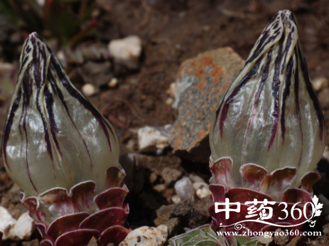 多年生草本,高3~5厘米。叶密集对生,似轮生状;叶片扇形,全缘,无柄。花1~3朵顶生,蓝紫色,并带有紫黑色条纹;萼管状,常5裂,裂片扇形;花冠钟形,先端5裂,裂片全缘;雄蕊5;子房上位。蒴果成熟时2瓣裂。