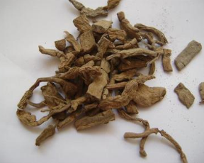 【药材性状】根茎呈圆柱形,略扁,稍弯曲,少分枝,长1.5~8厘米,直径0.5~2厘米,表面暗棕色或灰褐色。有紧密隆起的环节和突起的点状根痕,有的顶端略膨大, 具茎、叶残基,质坚实,不易折断,折断面略平坦,黄棕色或灰棕色,可见筋脉点(维管束)断续排列成环。根细长,稍弯曲,长3~15厘米,直径约 0.2厘米,有浅纵皱纹,质脆。气特异,味微苦、辛。