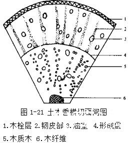 根横切面:木栓层为5-8列木栓细胞。韧皮部宽广。形成层成环。木质部射线宽6-25列细胞,导管单个或数个成群,径向排列,木纤维少数。薄壁细胞 含菊糖。油室分布于韧皮部及木质部中(图1-21)。