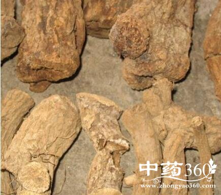 木香:为菊科植物木香Aucklandia lappa I)ecne.的十燥根。呈圆柱形或半圆柱形,长5~10 cm,直径O.5~5 cm。表面黄棕色至灰褐色,有明显的皱纹、纵沟及侧根痕。质坚,不易折断,断面灰褐色至暗褐色,剧边灰黄色或浅棕黄色,形成层环棕色,有放射状纹理及散在的褐色点状油窄。气香特异,味微苦。