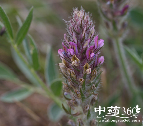 多年生草本。主根极粗壮,圆柱形。茎极短。单数羽状复叶,长6~10厘米,叶轴细弱,密生长柔毛;小叶7~13,对生,线形,长1.3~2.5厘米,宽1~2毫米,被长柔毛;托叶小,披针形,与叶柄连合。花2~5朵排列成近头状的总状花序;花萼筒状,萼齿条形;花冠紫红色、紫色或红色。荚果近卵圆形,密生短柔毛。