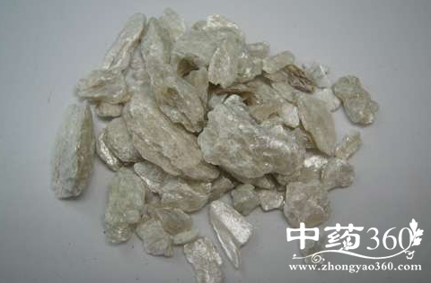【性状】本品多为块状集合体。呈不规则的块状。白色、黄白色或淡蓝灰色,有蜡样光泽。质软细腻,手摸有滑润感,无吸湿性,置水中不崩散。无臭,无味。