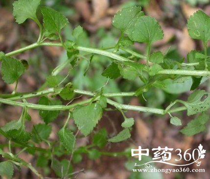 纤细匍匐状草本,长20~40厘米。茎绿色,纤细,径约2毫米,具纵棱,有分枝。3小叶聚生,有短柄,中间的叶片较大,柄亦较长;叶片卵形,长5~10毫米,宽4~9毫米,先端尖,基部圆形或阔楔形,边缘有粗锯齿。花小,长约5毫米,腋生,无柄;萼5裂,裂片近三角形,复3裂,基部与子房贴生;花冠白色,或淡紫色,5裂,子房半下位。蒴果。