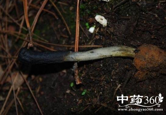 性状鉴别 子座长2-6cm,基部残有根状菌丝束。头部椭圆形、倒卵形或棒形,长5-13mm,直径3-5mm,黑褐色或暗褐色;柄部直径1-2.5mm,少分枝,暗绿色,有纵纹。质脆,易折断,断面黑褐色。气微腥,味淡。